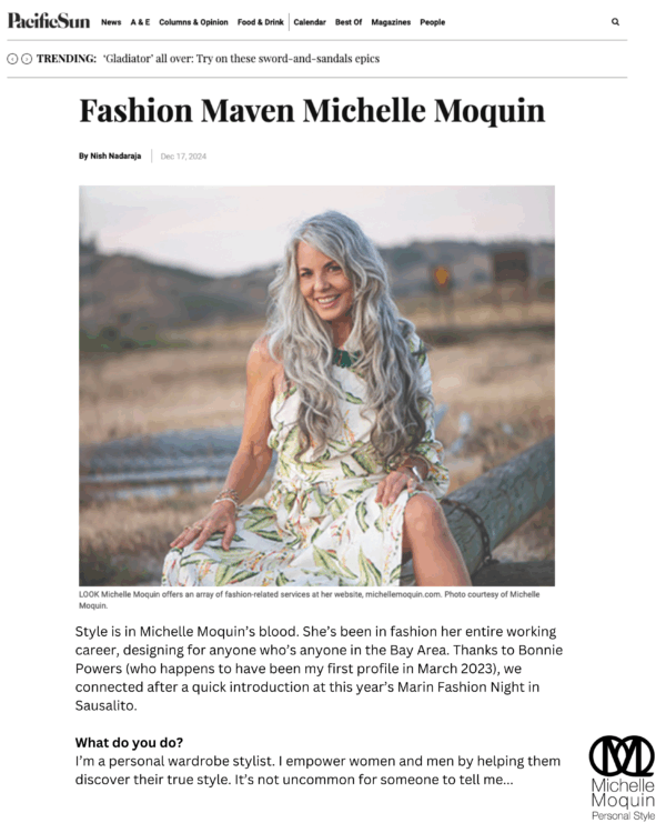 Style is in Michelle Moquin’s blood. She’s been in fashion her entire working career, designing for anyone who’s anyone in the Bay Area. Thanks to Bonnie Powers (who happens to have been my first profile in March 2023), we connected after a quick introduction at this year’s Marin Fashion Night in Sausalito.